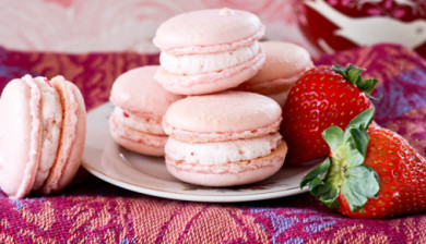 Indulge in your very own macaroon madness with this gorgeous French Style Strawberry Macaroon recipe. Ingredients: Macaroon shells: 200g icing sugar, 100g ground almond, 100g egg whites, 25g caster sugar, 1 cap of food colouring Filling: 125g soft unsalted butter, 1 heaped dessert spo